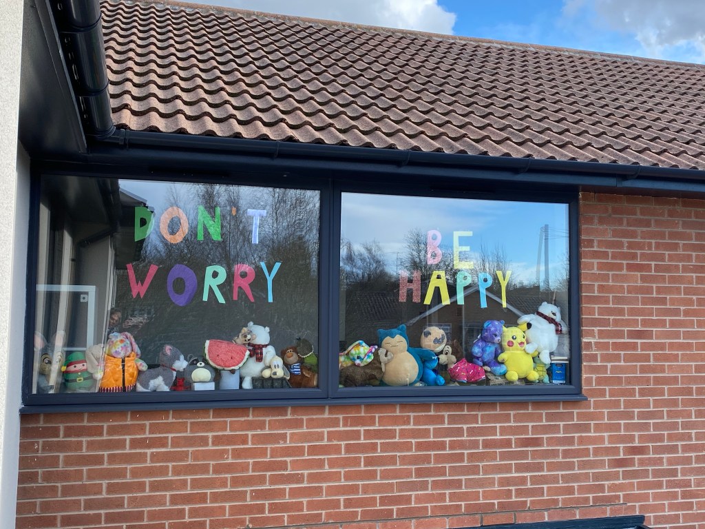 I have one such story on the go at the moment, and my attempts to sabotage are reaching new highs (or lows, depending on how you want to look at it). If I carry on like this, I estimate I’ll have exhausted my rather extensive tea and biscuit supplies in a few days. The bathroom is clean, the beds are changed, I’m finally on top of the washing pile, I even found time to create a feel-good slogan with accompanying stuffed animals in our window (and take a picture of it for your appreciation).