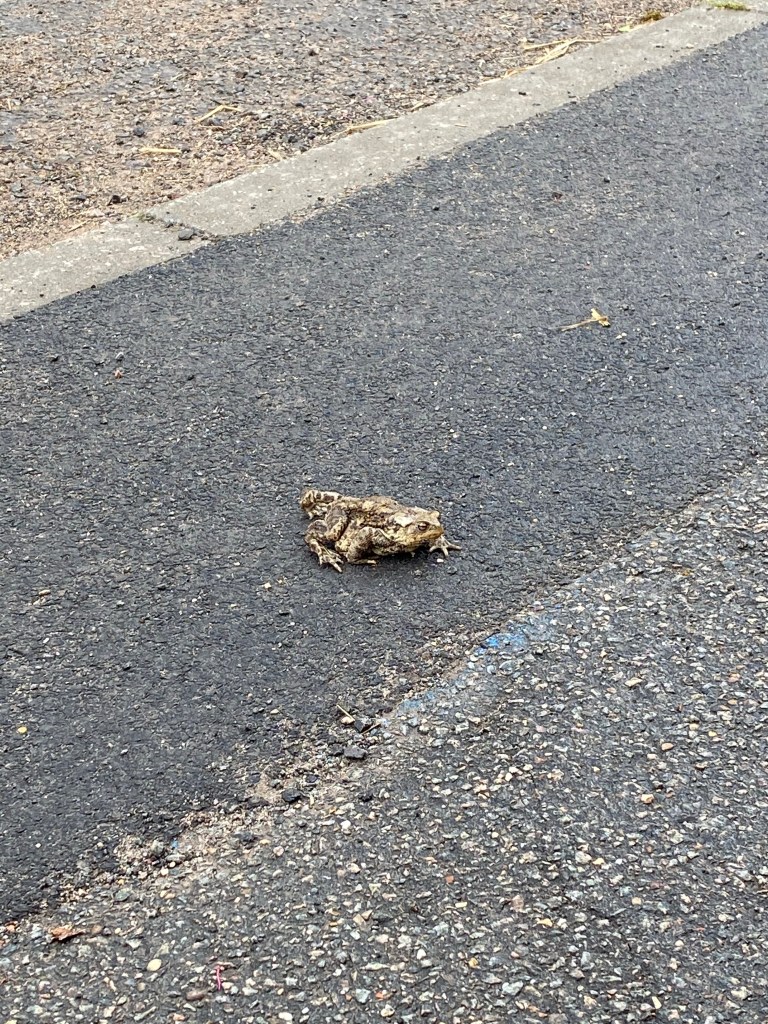 Even more delight greeted me on the pavement in the form of a huge toad. I watched him for a while, he obligingly posed for a few photographs (I got as close as I dared without inadvertently inviting the dog to an unsanctioned lunch), then I ushered him into some bushes and out of the path of a reversing car, commenting to a bemused passer-by that I was ‘just helping Mr Toad avoid being run over.’ (If I carry on like this I’ll begin cultivating an interesting reputation in my village).